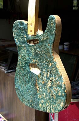 Lighweight swamp ash with blue-green dyed maple burl topset